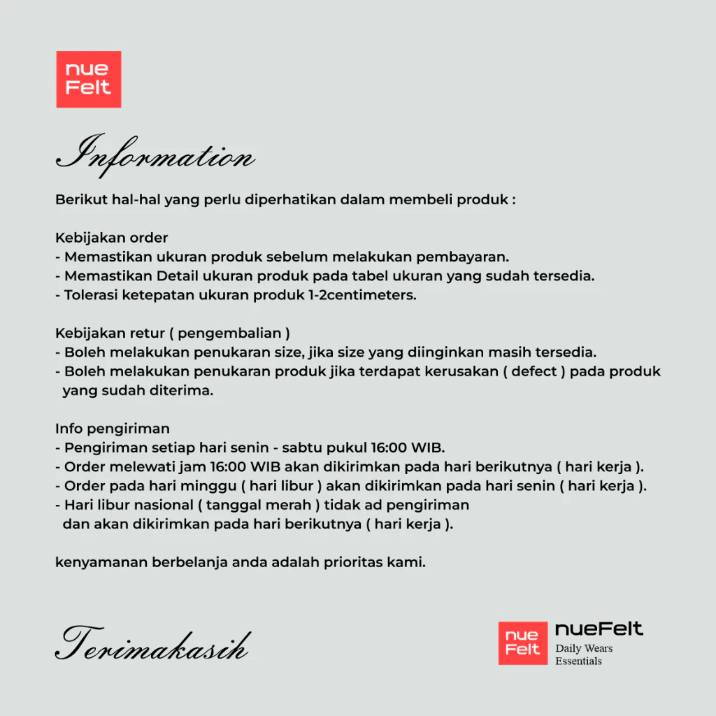* Pesanan yang sudah dipacking tidak bisa diganti/ditukar, harap periksa kembali pesanan sebelum melakukan check out. Product yang sudah sesuai dengan pesanan tidak bisa diretur.